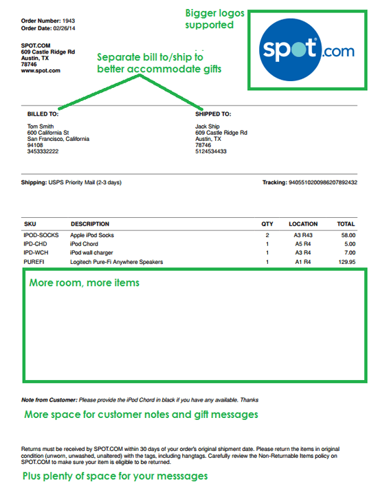 We solicited and received comprehensive feedback on the evolution of our Packing Slips. We learned that our customers use these in very different ways – which means more flexibility and larger spaces for messages in particular.