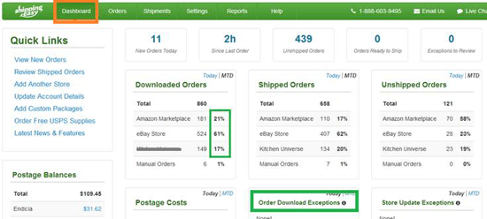 Easily view Today’s (or month to date) Orders, Shipments and Exceptions at a glance. Plus, a breakdown of Orders by store and Postage by carrier. Everything a business owner needs to see at a glance, including any “exceptions”.- Exceptions – are Orders that we can detect in your store – but are unable to download OR shipments that have not been successful at updating back in your store. This will save you scanning through Shipment History or reconciling your Orders in ShippingEasy vs Stores. Ahhhh – more time saving.