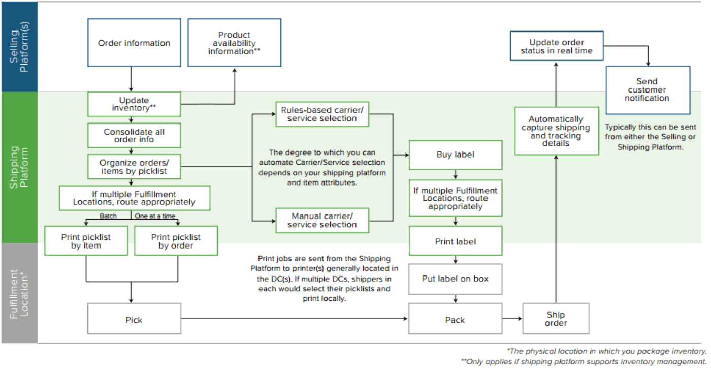 What follows is the end-to-end process for a more advanced scenario, where product weight and dimensions are included in the product data feed from the selling platform(s) to the shipping platform. Having this information in the order data feed allows a seller to reduce their shipping workload by 20%-40% versus having to manually weigh each order. Here’s the process: