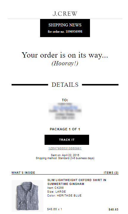 The other essential part of an effective shipping confirmation email is what you see below: a friendly, reassuring or congratulatory tone that reflects your brand voice: “Your order is on its way…Hooray!” This helps inform the customer of the status of the shipment. An added touch is providing easy and tap friendly tracking to help the customer follow their package’s progress.