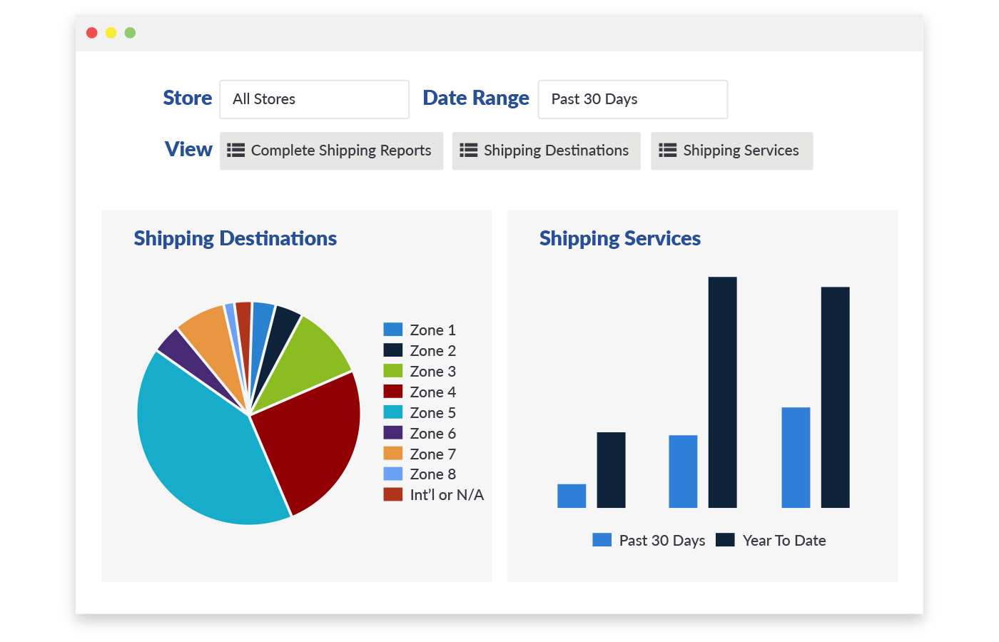 - Run comprehensive shipping reports, or segment by destination or service