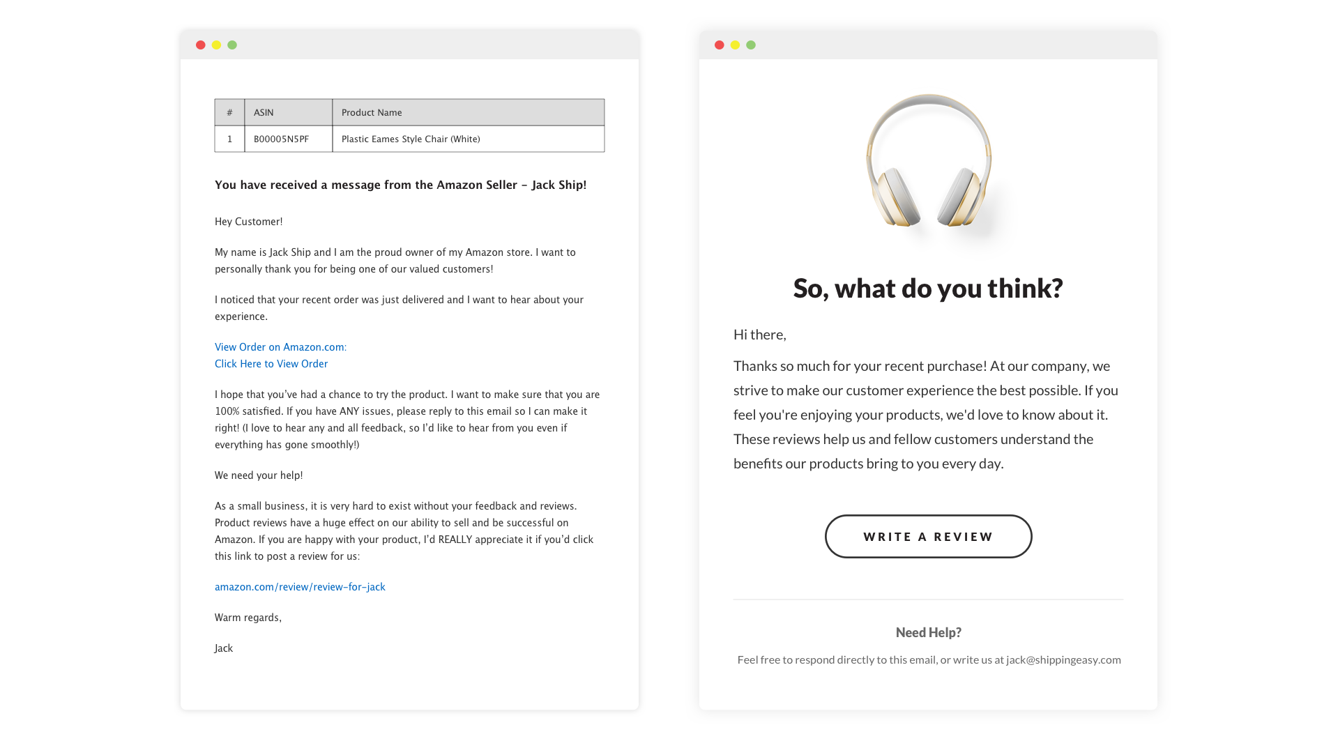 Humans are visual creatures. Particularly in email, long blocks of copy just doesn’t get people’s attention. They also don’t create a visual cue to the product a customer purchased. Many solutions that help Amazon sellers solicit Amazon product reviews unfortunately take the text-based approach. Let’s look at an anonymized version of a real email I’ve received from an Amazon seller requesting a product review from me. Then let’s compare it to one you can build in ShippingEasy.