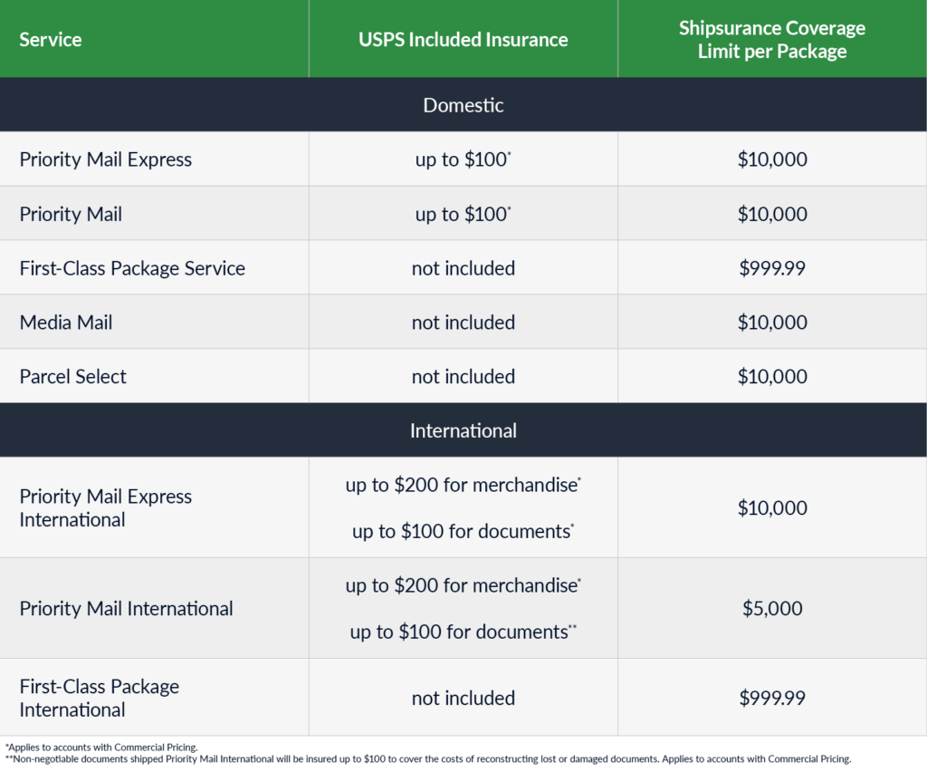 Only specific USPS services have built-in insurance options, including Priority Mail and Priority Mail Express. ShippingEasy users have access to Commercial rates, so Priority Mail and Priority Mail Express shipments are eligible for up to $100 in USPS insurance. This amount varies with international shipments and whether valuable jewelry or documents are being shipped. We’ve included a table below to show the options available for some of the most utilized USPS carrier services.