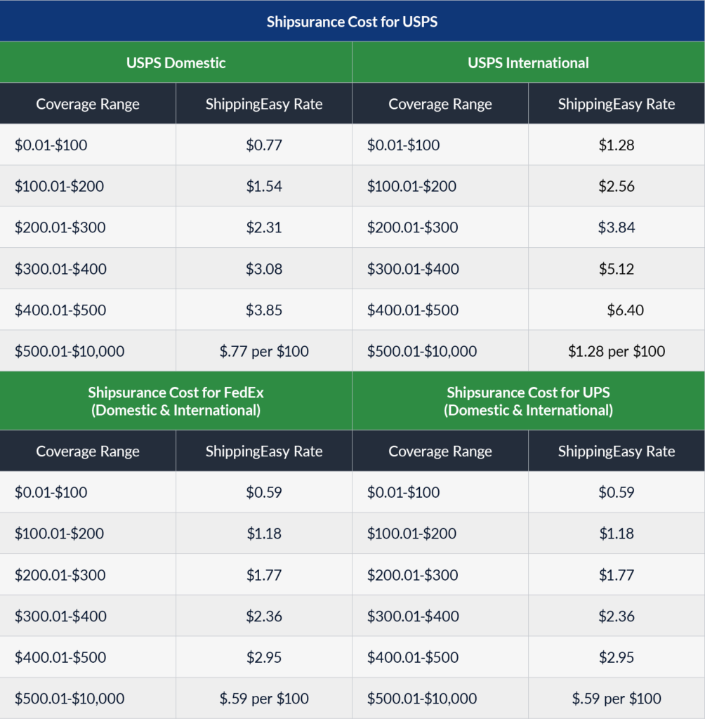 ShippingEasy partners with a third-party insurance provider called Shipsurance to give users more insurance options for their valuable shipments. The cost of Shipsurance varies depending on the amount of insurance being purchased, and the amount of Shipsurance available to each shipment depends on the carrier and/or service being used. For example, a First Class package is only eligible for $999.99 worth of Shipsurance while a Priority Mail shipment is eligible for up to $10,000. We’ve included a table below showing how these fees are calculated.