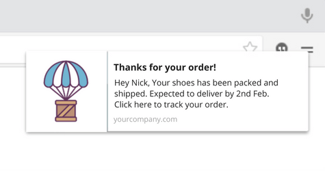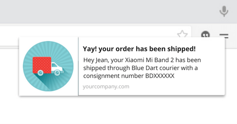 Such Web Push Notifications confirm the order as well as mention the expected date of delivery. This not only saves precious time checking email, but also keeps customers updated with real-time order confirmations.