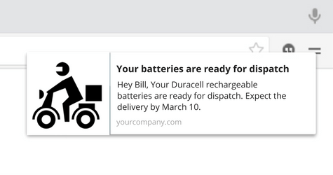 To earn and maintain trust, keeping customers informed about their order status through timely Web Push Notifications is a good option. For instance, when Jeff receives a notification stating “Your Duracell rechargeable batteries are ready for dispatch,” he knows his order has been processed. Keeping customers informed goes a long way toward repeat business.