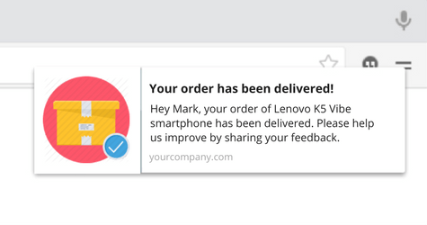 Once a product is delivered to the customer, a Web Push Notification closing the specific order and confirming the delivery is necessary. This is also your chance to ask the customer to share feedback on the product. Customers won’t need to be on the retailer’s website when the notification is sent. The customer can be on any device or any website and receive the notification.